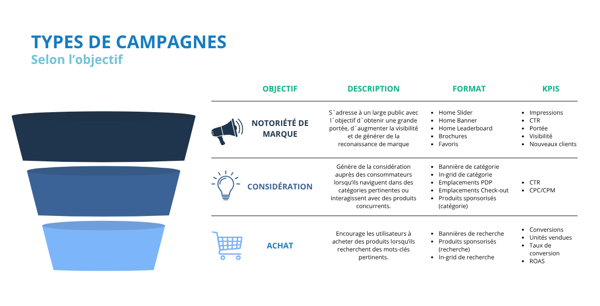 Dans les campagnes digitales, les KPIs se regroupent selon les étapes du tunnel de conversion.
